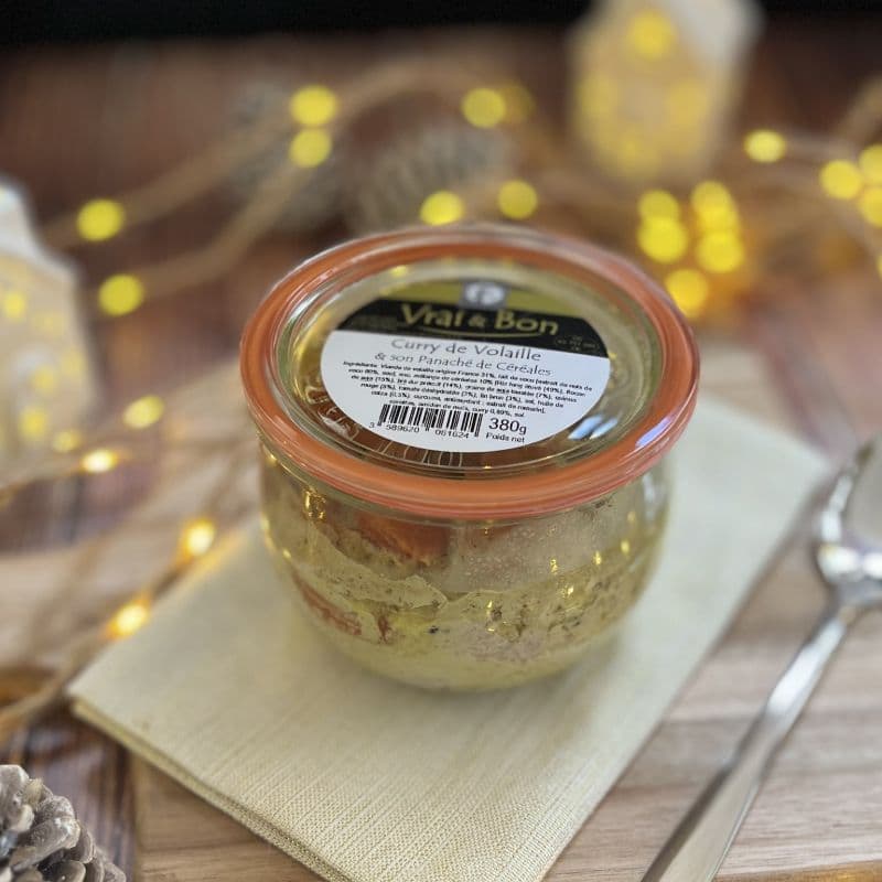 Viande de volaille origine France 31%, lait de coco [extrait de noix de coco 60%, eau], eau, carottes, riz, blé dur précuit (contient gluten), amidon de maïs, curry 0.97%, sel, quinoa rouge, lin brun.