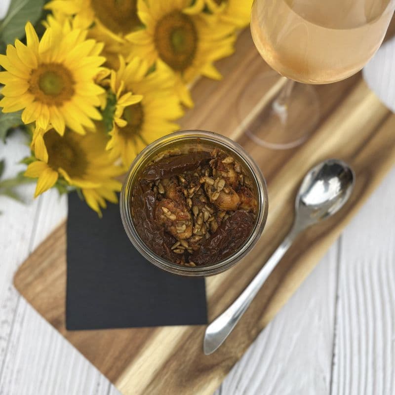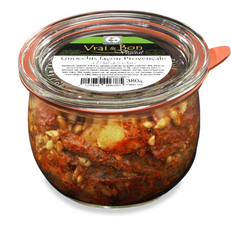 Pulpe de tomate, gnocchis 31% [Eau, semoule de blé dur 36%, amidon de pomme de terre, flocon de pomme de terre (pommes de terre, curcuma), sel], huile de tournesol, tomates séchées [Tomates séchées, huile de tournesol, basilic, poivre noir, ail, persil, vinaigre de vin, sel, correcteur d’acidité : acide citrique (E330)], graines de tournesol, sel, ail, piment.