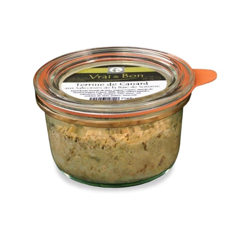 Viande de porc origine France, viande de canard origine France 30%, œufs entiers liquides, salicornes 5%, vinaigre, eau, sucre, sel, amidon de mais, poivre, muscade